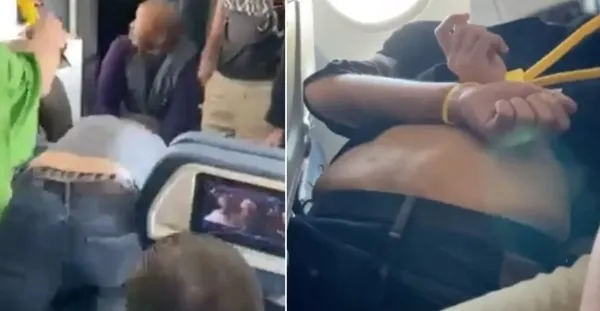 Uçaktaki bir yolcu tarafından kaydedilen görüntülerde, yere yatırılan yolcunun ellerinin arkasından bağlandığı ve uçağın arka kısmını götürüldüğü anlar kameraya yansıdı.