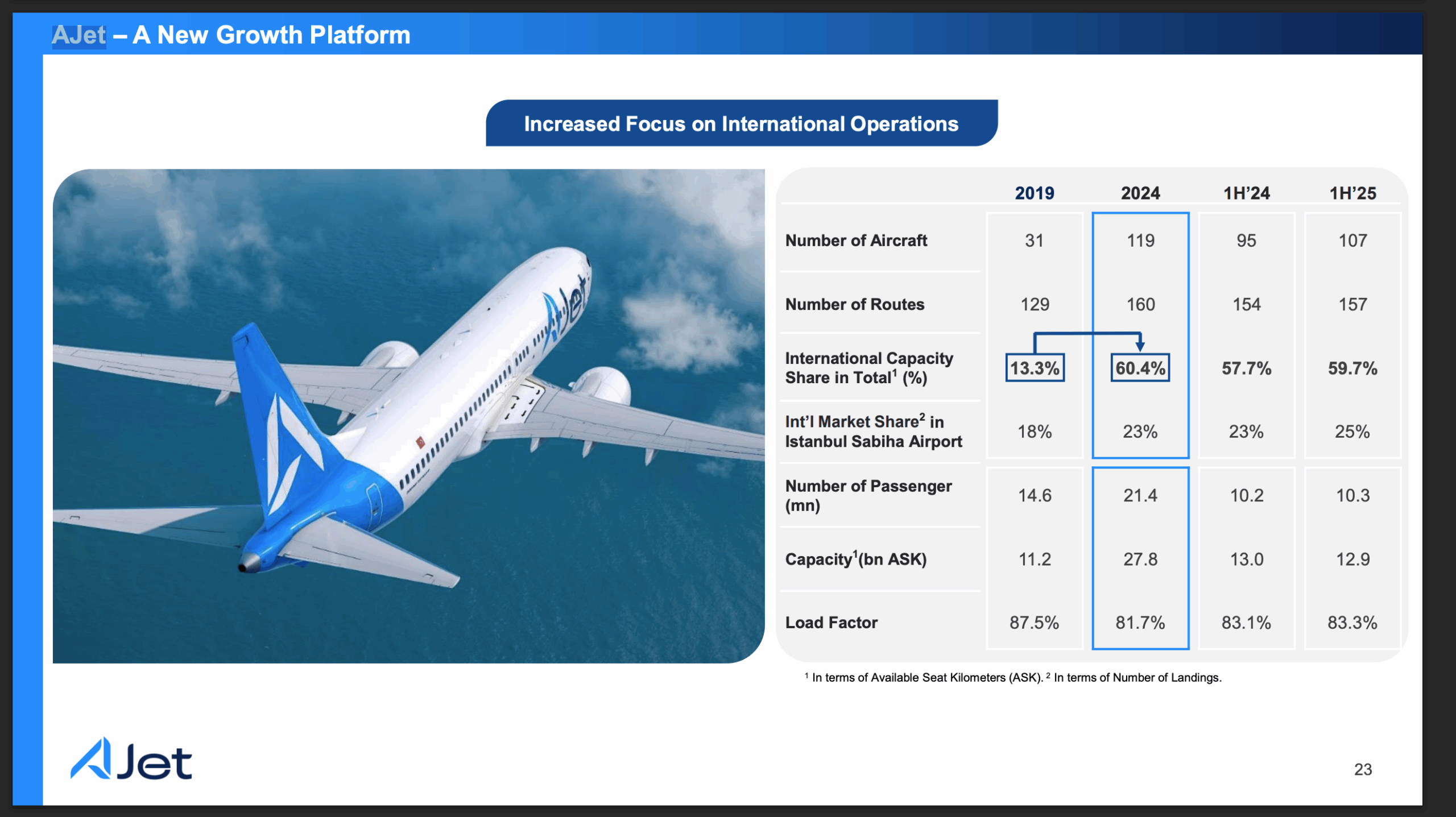 Yurt dışı operasyonlarını genişletmeye devam eden AJet’in dış hat kapasitesinin toplam içindeki payı yüzde 60’a ulaştı. Şirket, özellikle Avrupa ve Orta Doğu hatlarında artan frekanslarıyla rekabet gücünü artırırken, yolcu doluluk oranlarında da istikrarlı bir seyir izledi.